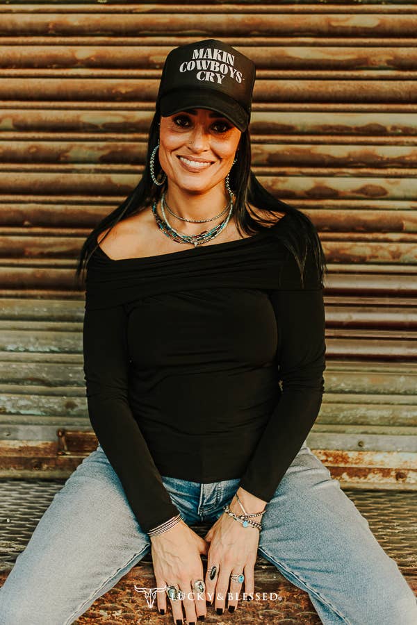 ✨ This solid off-the-shoulder top with long sleeves is a must-have for NFR Western Rodeo season! 🤠 Pair it with your favorite bottoms for an effortlessly chic look that’ll have you rodeo-ready in no time. Whether you're dressing it up or keeping it casual, this top has you covered! 🖤