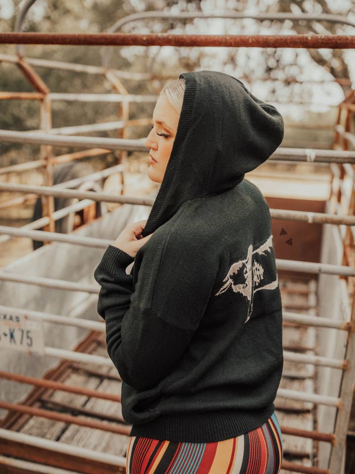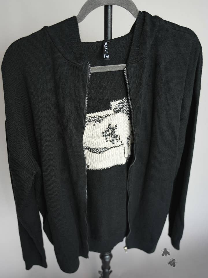 Stay cozy in this fully knit zip sweater with a playful twist - the back is peep-worthy! Plus, it's got pockets - need we say more? Perfect for any mood, you'll never want to take it off.