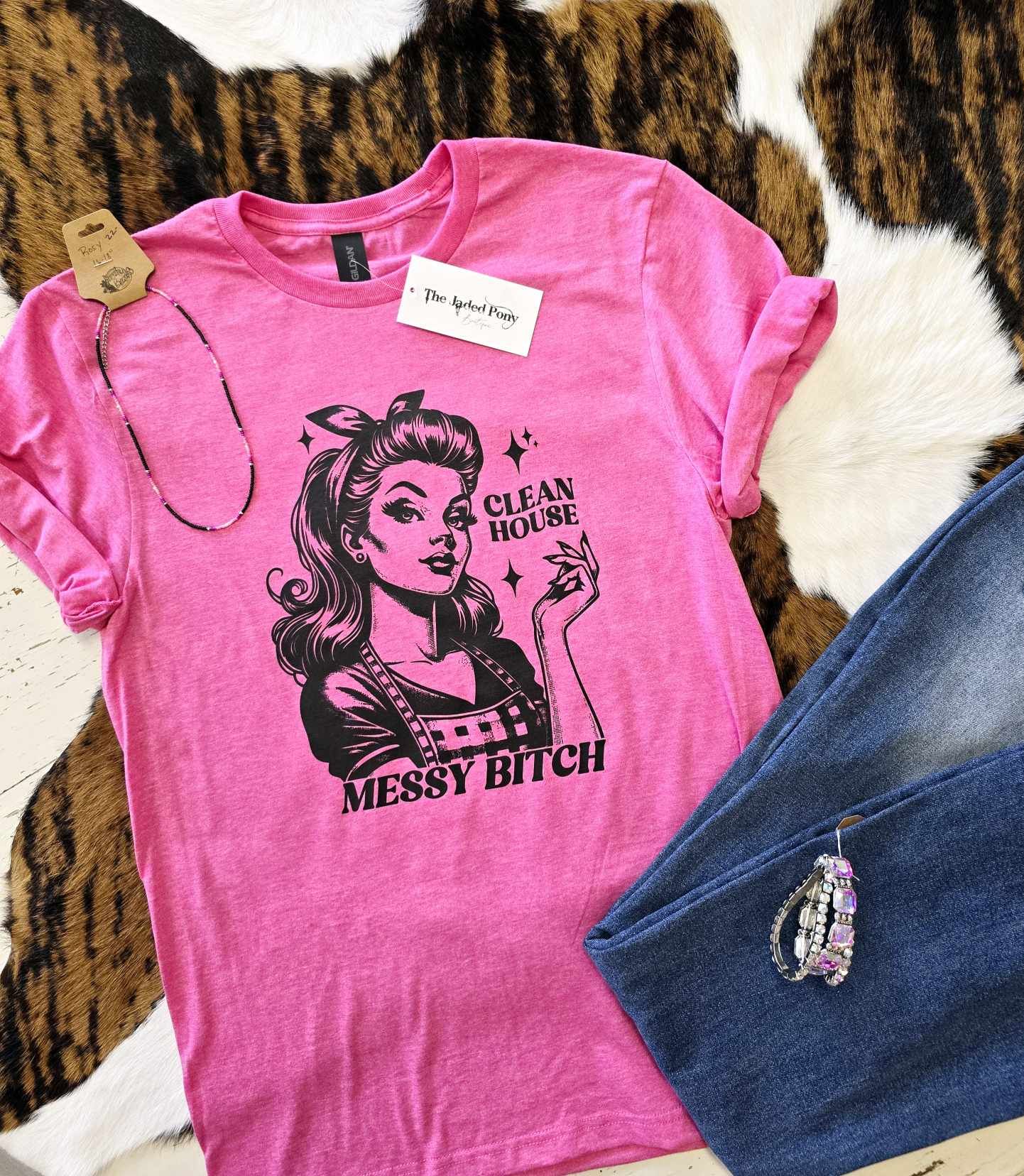 Get your cleaning game on with our Clean House....Messy B!tch Tee. Keep it casual while tackling domestic duties in this comfy tee. Let everyone know you're a boss at cleaning, even if you're a little messy.