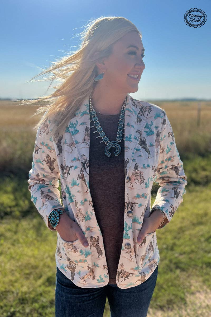 Make your mark on the trail with this lively Giddy Up Trail Blazer! Featuring a cream-colored canvas with a cowboy on a horse, cacti and, of course, buttons.