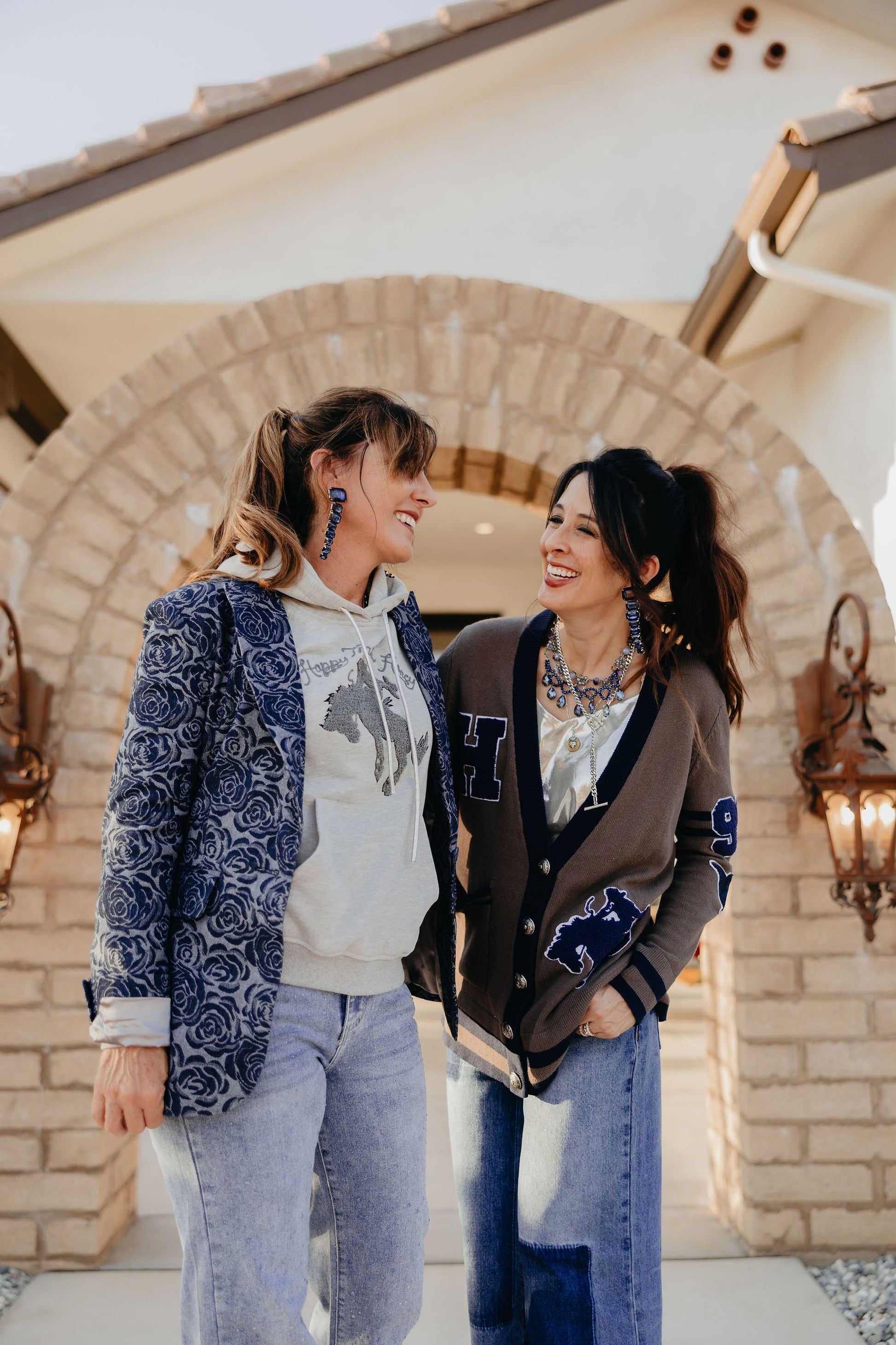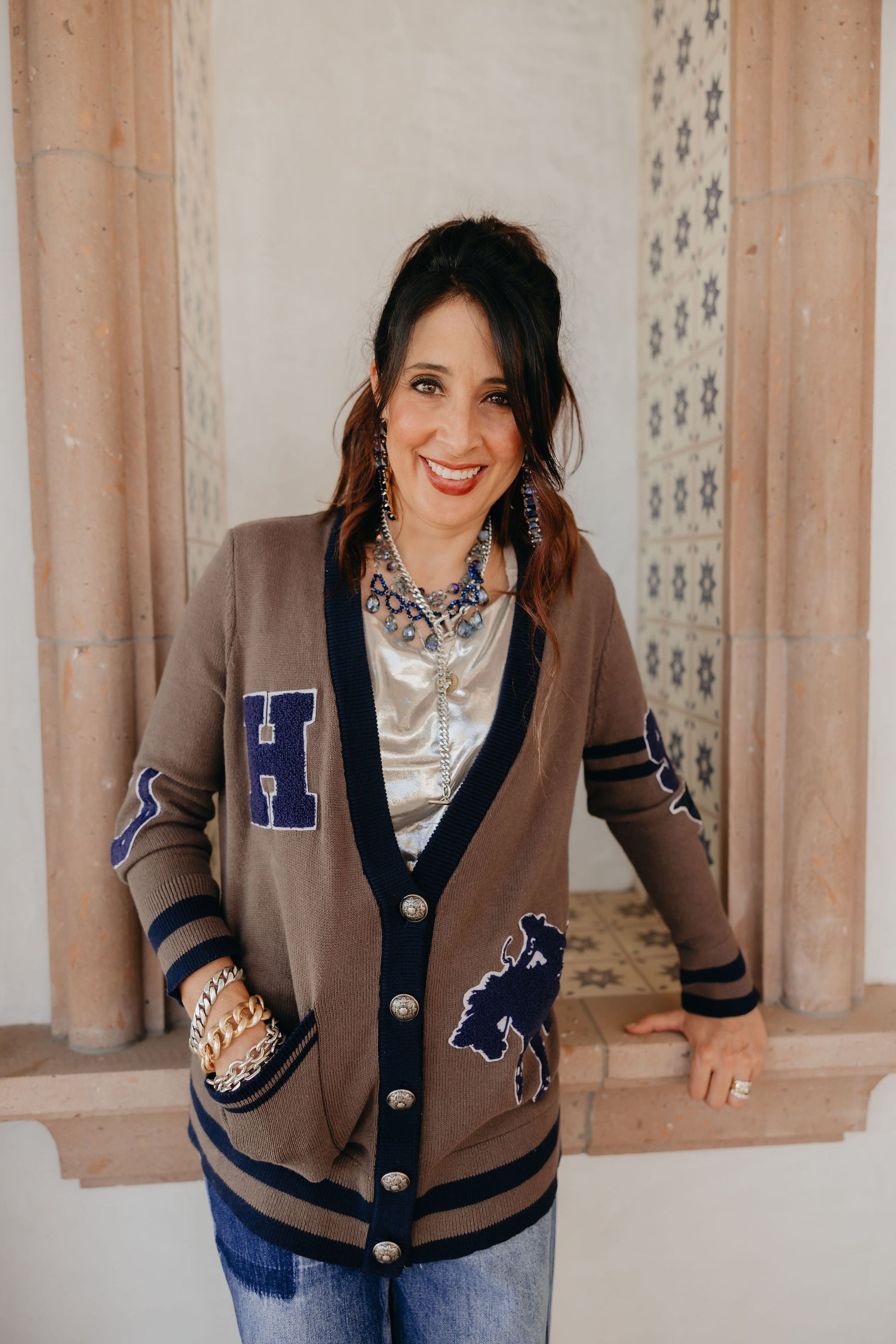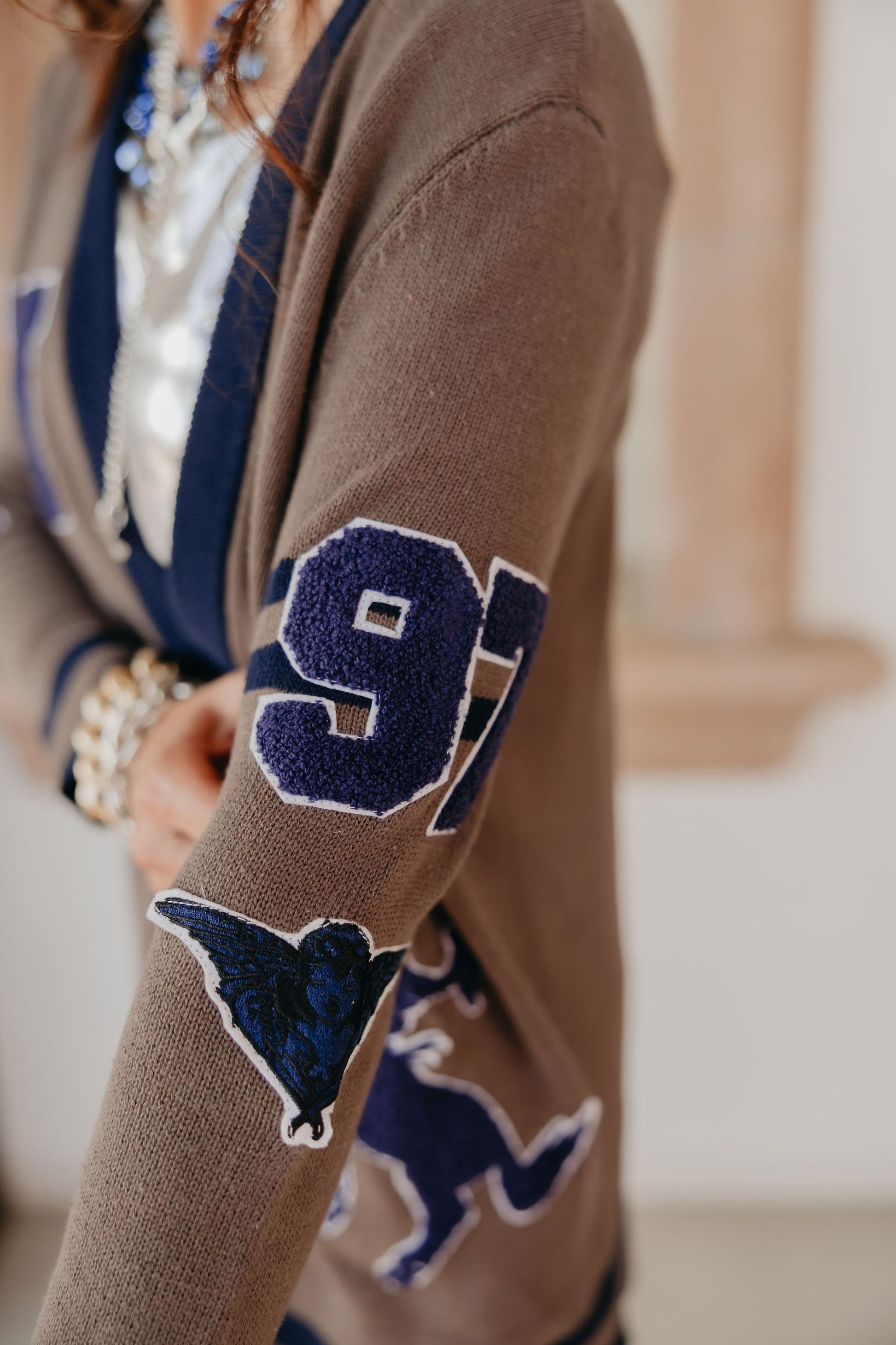 Inspired by the iconic bronc-riding Hay family, this preppy yet classic cardigan pays homage to the legacy of Lily’s husband and in-laws. Embellished with personal touches—like family initials, Lily’s birth year ‘97, and angel wings honoring her great-grandmother—it’s filled with history and heart. The striking blue accents add a bold contrast, making this heritage piece perfect for dressing up, whether you're in the arena or at the after-party.