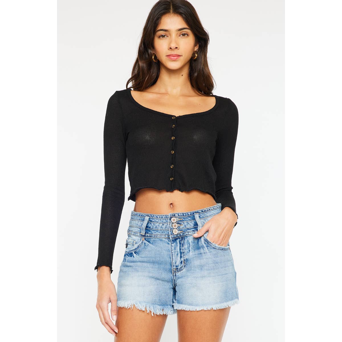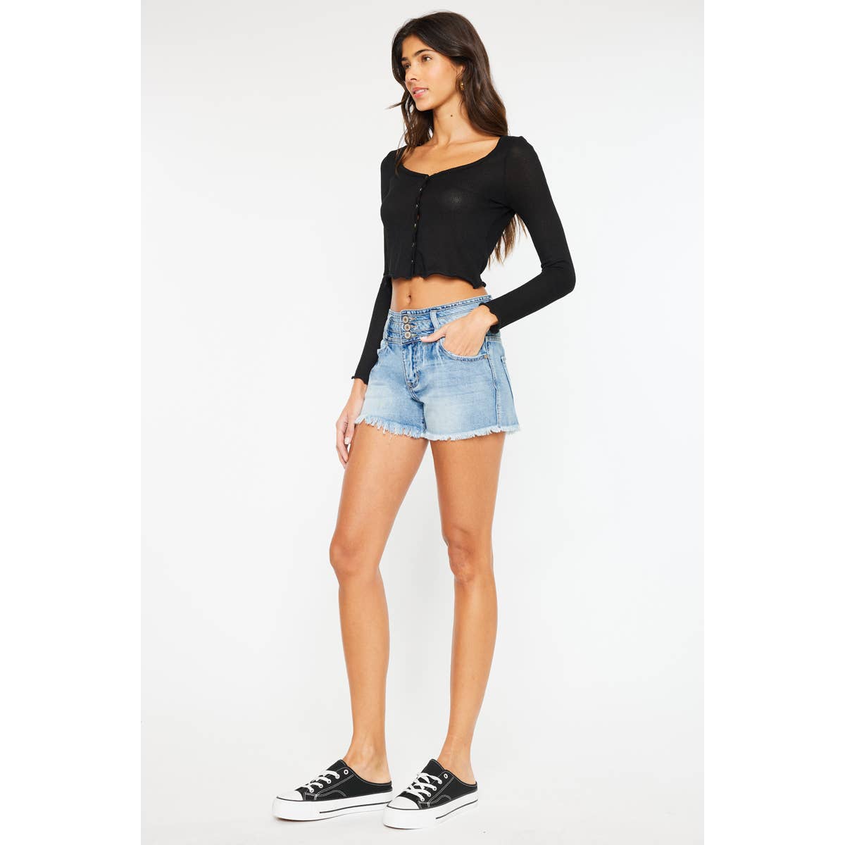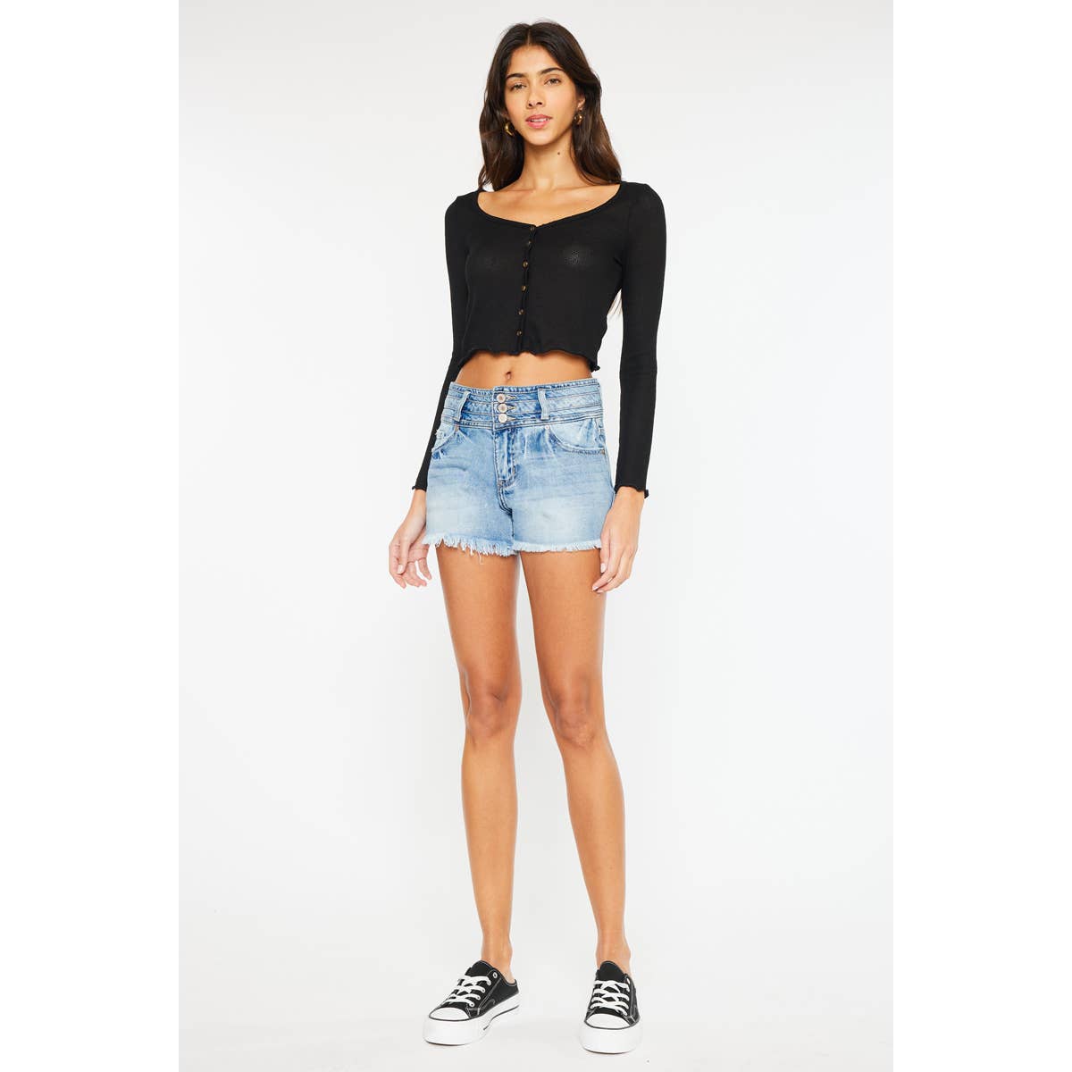Kancan Women's High Rise Triple Button Waistband Frayed Hem Shorts