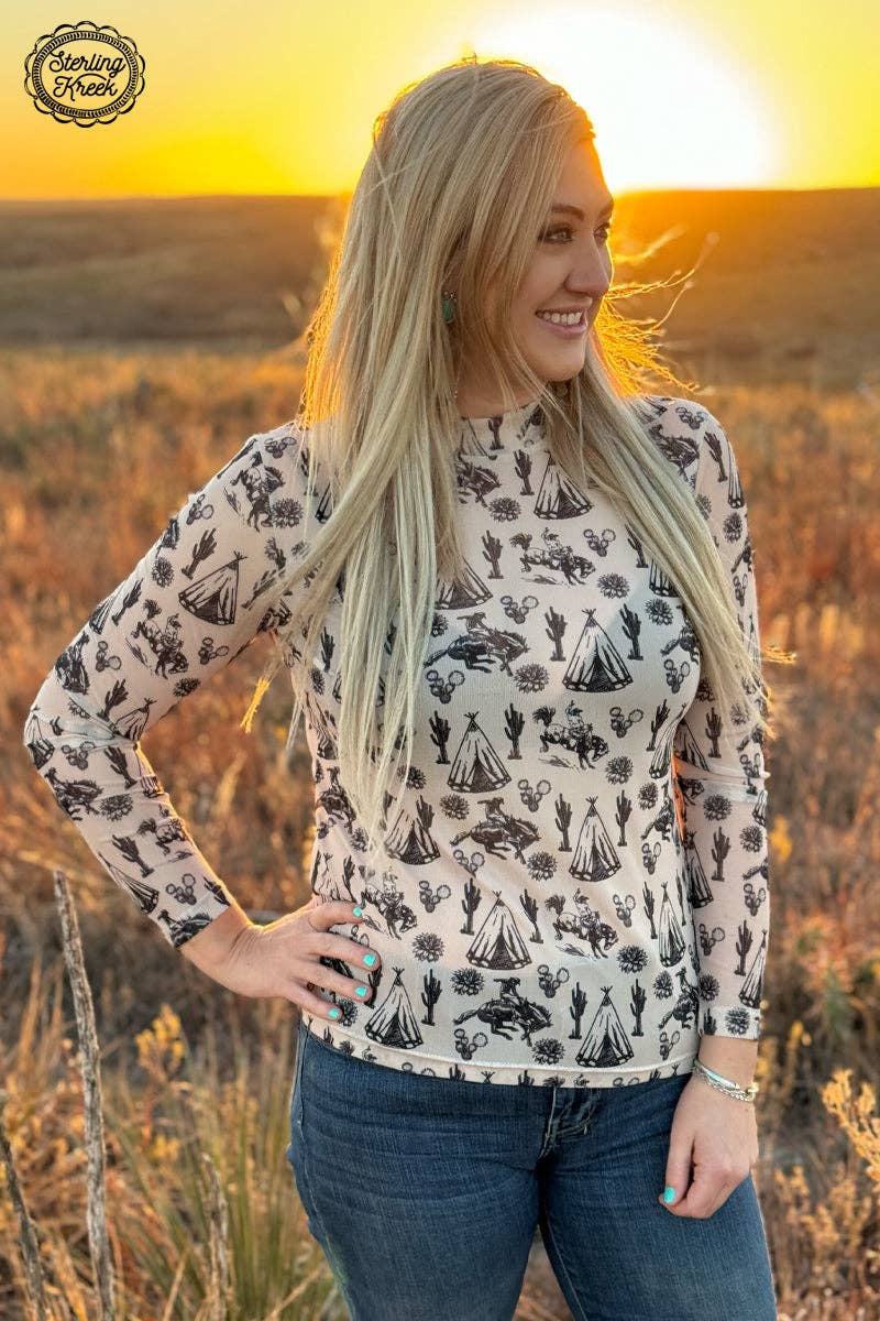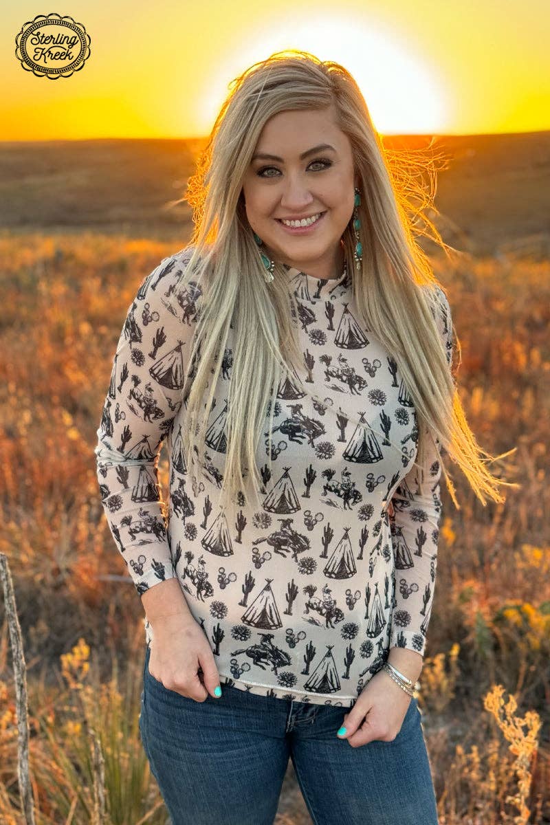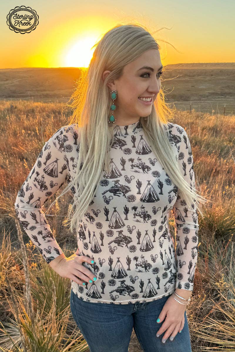 Be the trendsetter in this one-of-a-kind Lakota Hills Top! This cream mesh long sleeve top shows off your wild west side with its classic western design featuring tee pees, cacti, and a cowboy wilding out on a bronco. Yeehaw, partner!