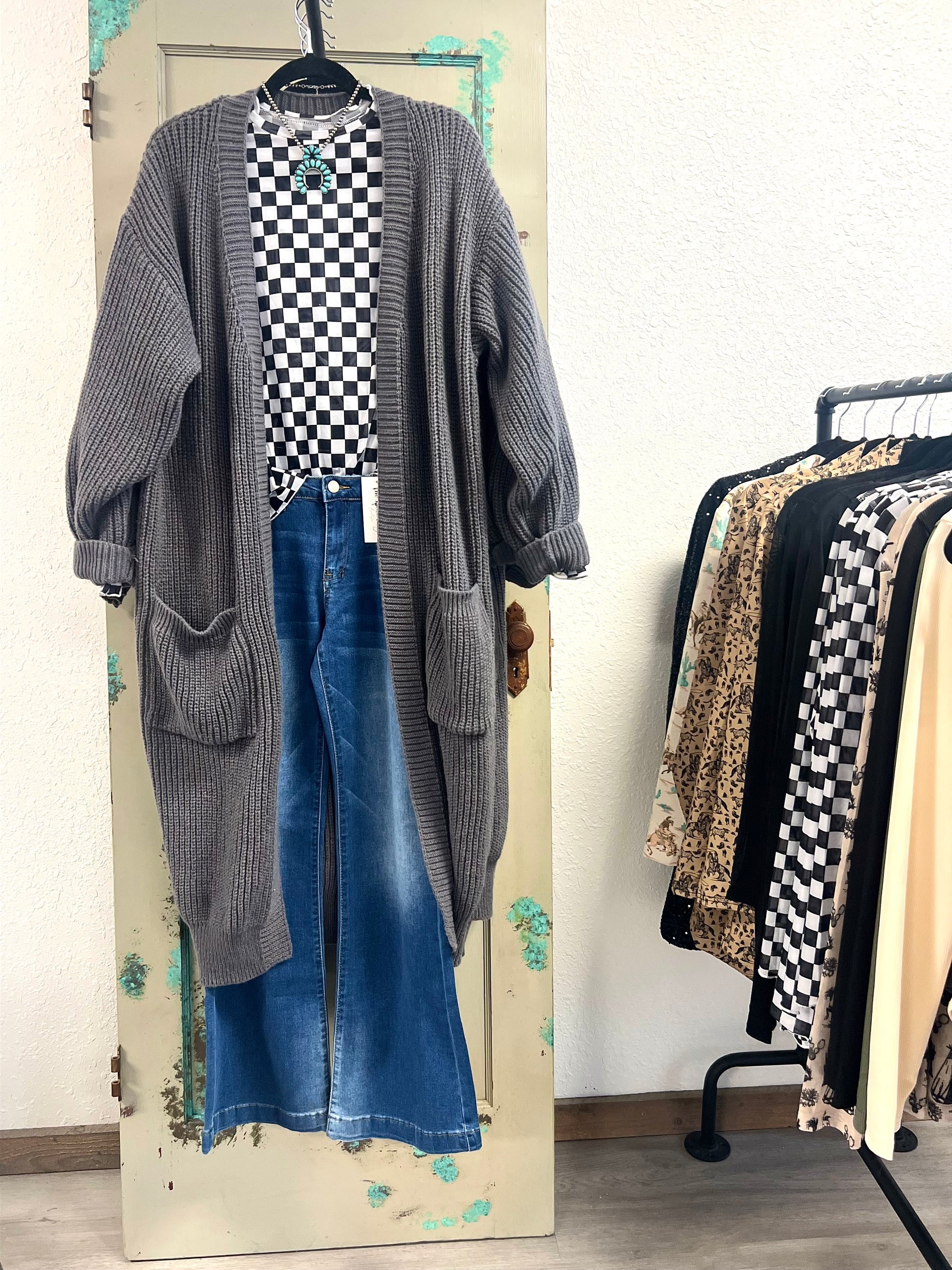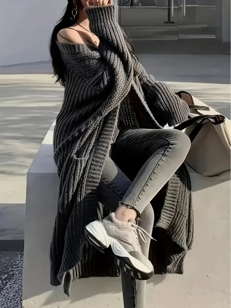 Wrap yourself in the ultimate winter hug with this Long Length Plus Size Open Front Loose Knit Cardigan in a moody dark grey. Crafted from 100% polyester, it’s as cozy as a crackling fire on a frosty night. The roomy, oversized fit makes it perfect for layering over your favorite chunky knits or even your snow day pajamas. Whether you're heading out for cocoa or just need an extra layer of warmth at home, this cardigan is ready to bring the snug vibes all season long. Winter? Handled!