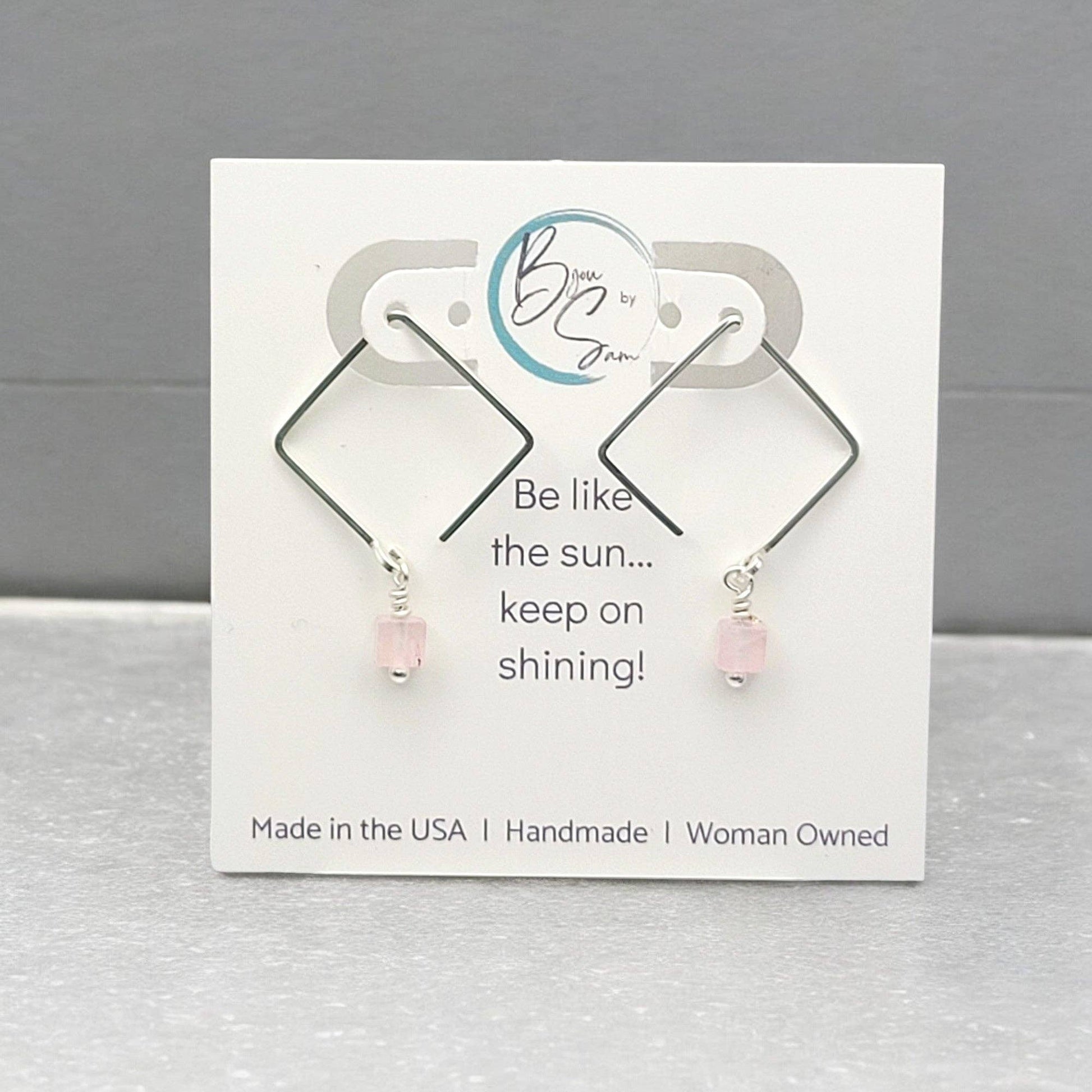 Quirky and fun earrings crafted with .940 Argentium Sterling Silver to prevent tarnish. Measures around 1.5" with 4mm Rose Quartz beads. Each pair is unique due to handcut gemstones. Handmade in Montana, Woman Owned business. Comes on custom 2.5" square Affirmation Cards with uplifting sayings like "Hello Gorgeous" and "Hey, You're Awesome!" Perfect for gifting!