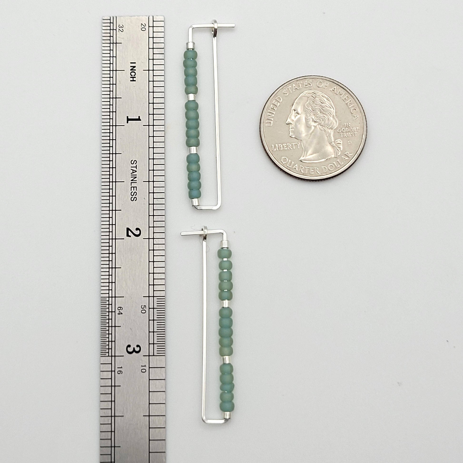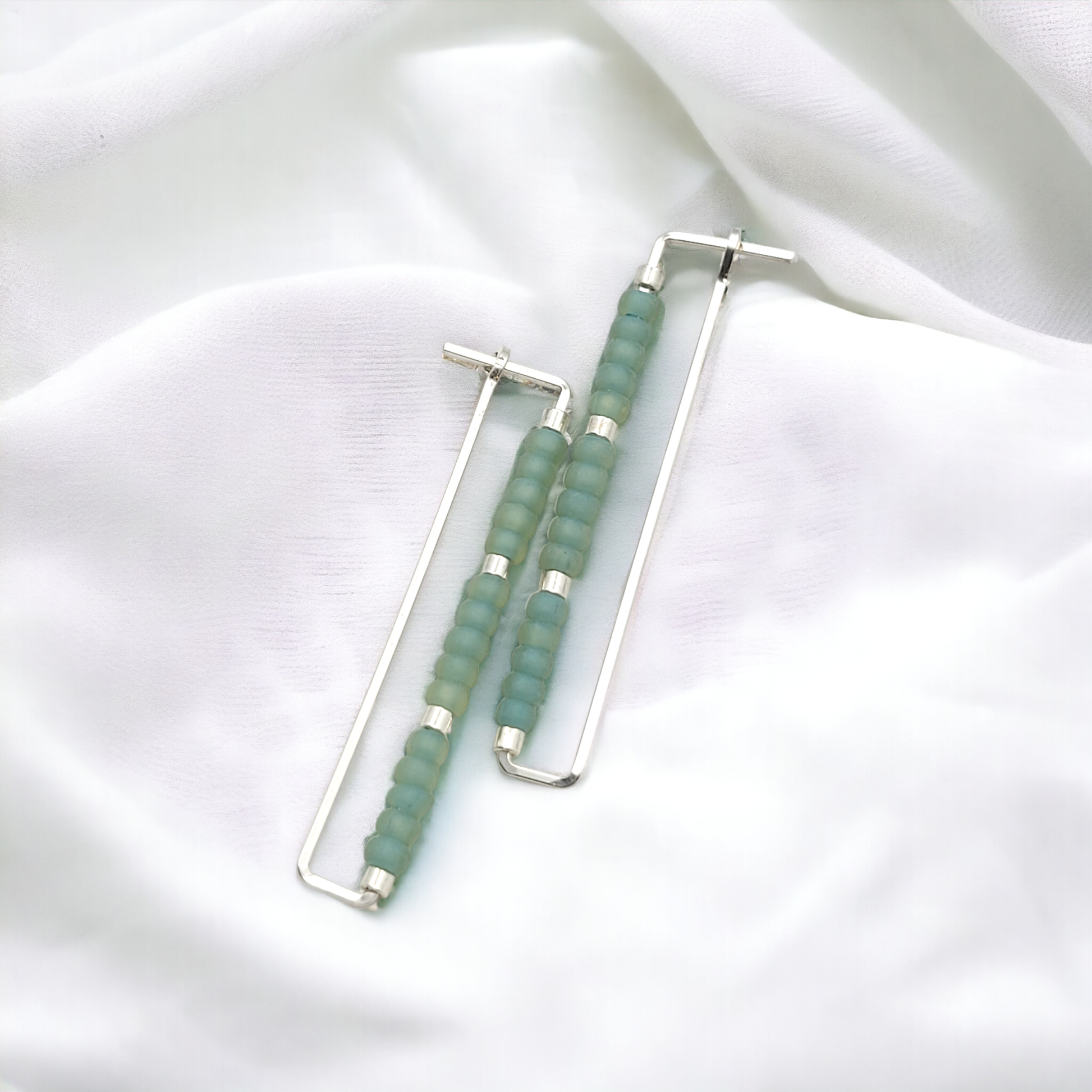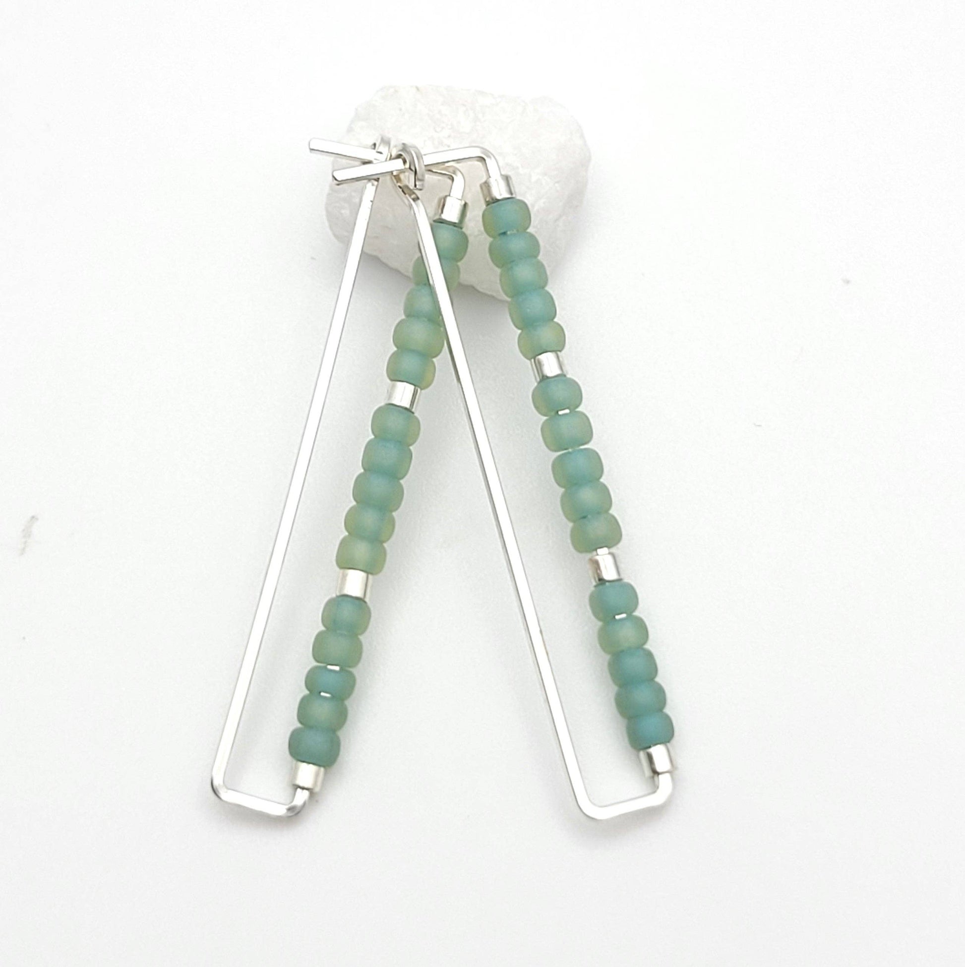 Rectangle Silver Earrings with Sea Glass Color Seed Beads