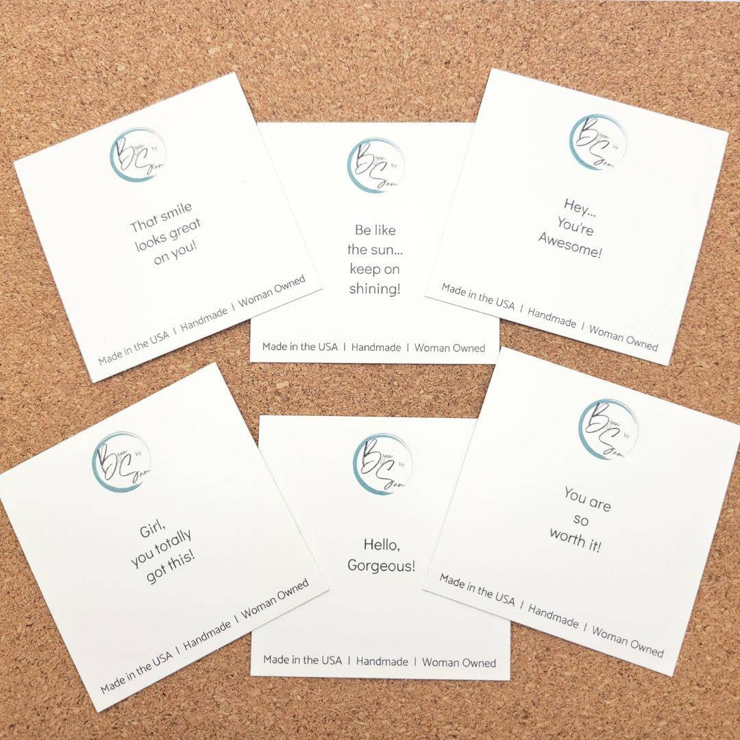 Every pair comes on a custom affirmation card with uplifting messages like “Hello Gorgeous” and “Hey, You’re Awesome!” Perfect for gifting!