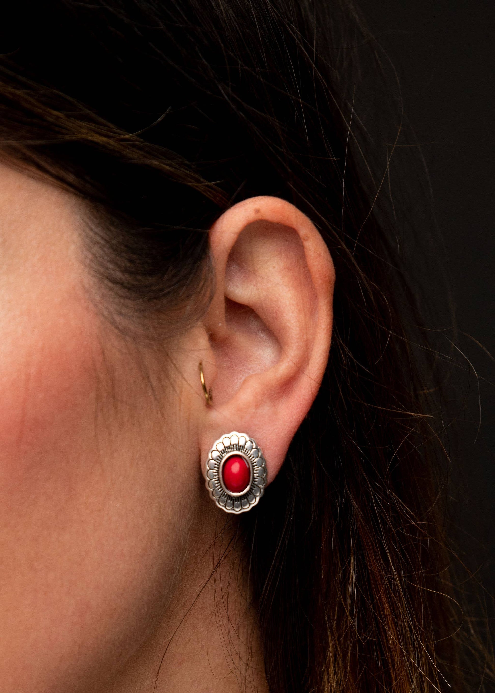 Small Burnished Silver Flower Stamped Concho Post Earring with Red Accent