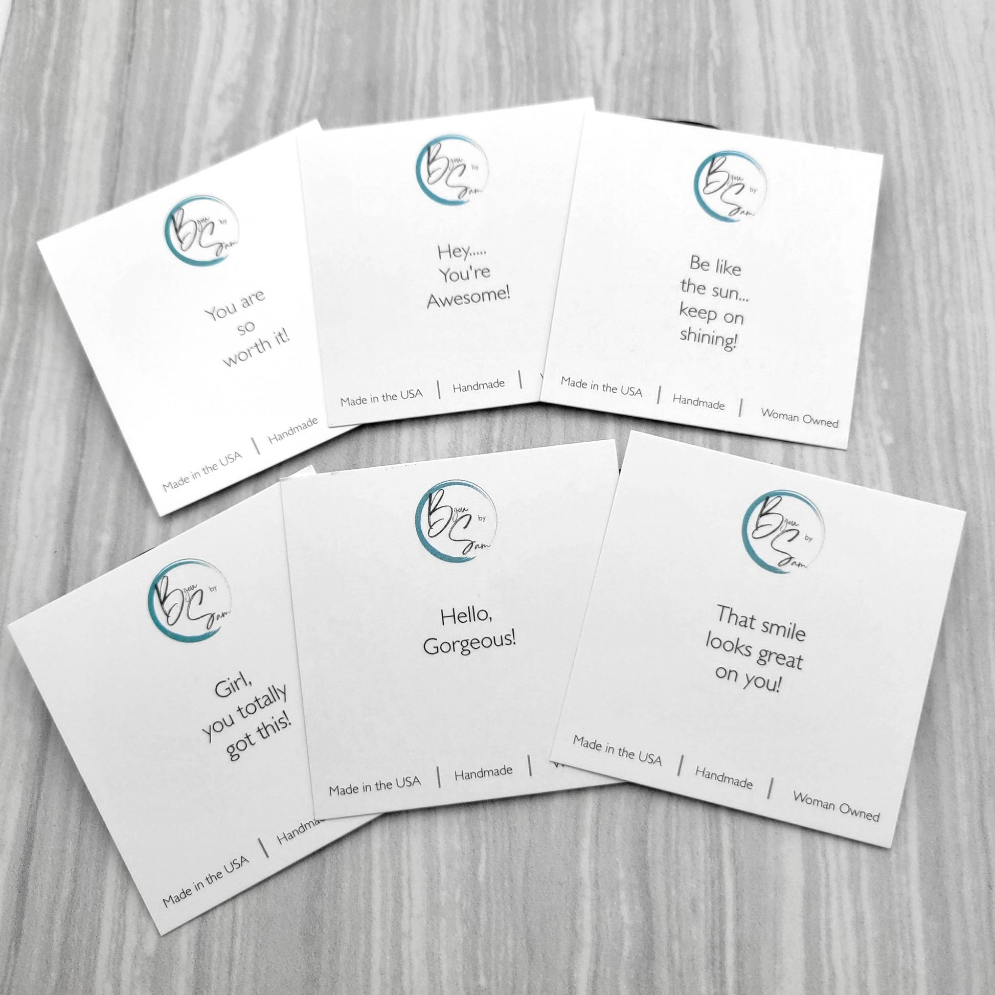 Each pair is displayed on a custom affirmation card with uplifting messages like “Hello Gorgeous” and “Hey, You’re Awesome!” Perfect for gifting!
