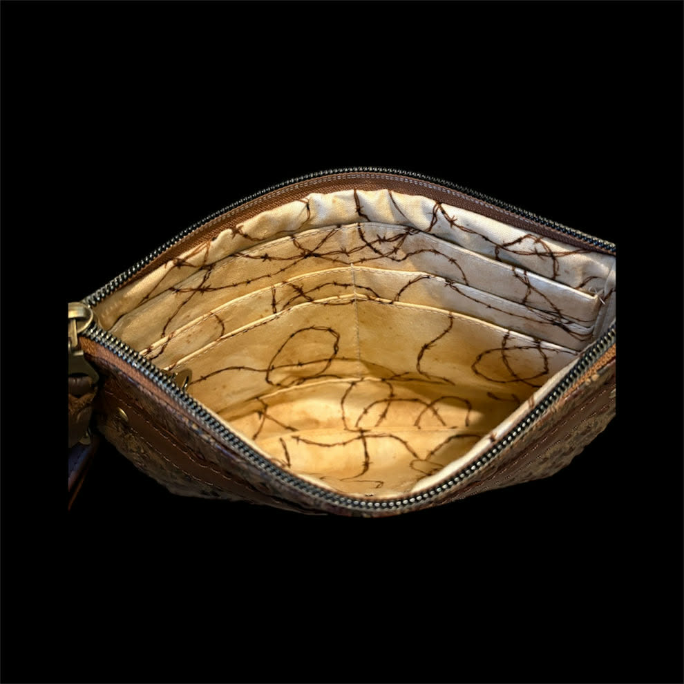 The interior is thoughtfully designed with Western fabric lining, a dedicated phone pocket, four credit card slots, and a secure zipper pocket—making it the perfect grab-and-go piece when you want to travel light without sacrificing style.