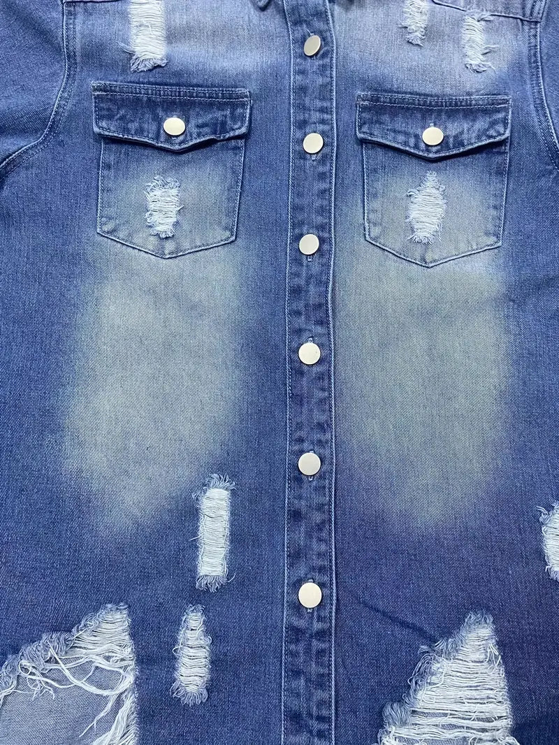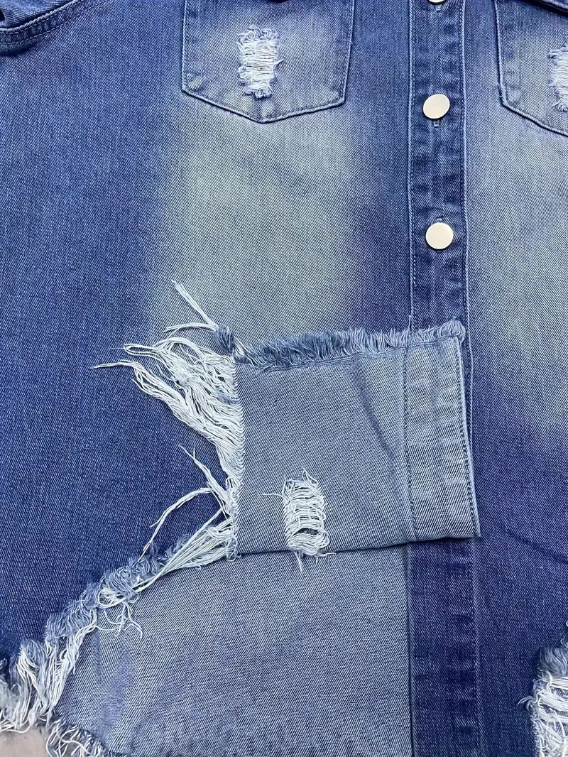 Meet your new fall obsession: the Women's Edgy Distressed Denim Shacket! With ripped holes, flap pockets, and a raw hem, this jacket screams effortless cool. Whether you're hitting the pumpkin patch or the city streets, this 82% cotton, 18% poly blend gives you that just-right mix of comfort and attitude. Throw it over anything and watch the compliments roll in!